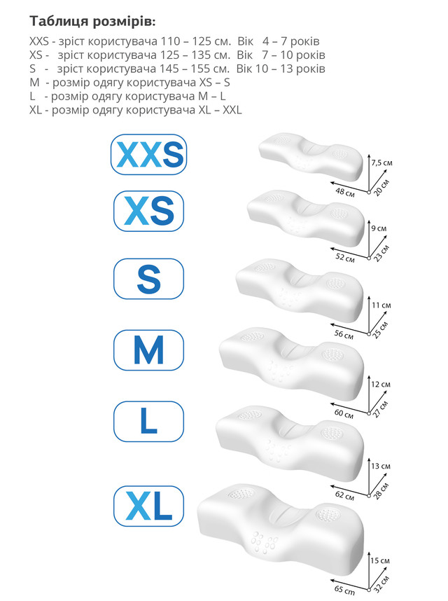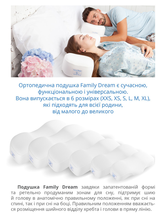 Ортопедична подушка Family Dream є сучасною, функціональною і універсальною. Вона випускається в 6 розмірах (XXS, XS, S, L, M, XL), які підходять для всієї родини, від малого до великого.