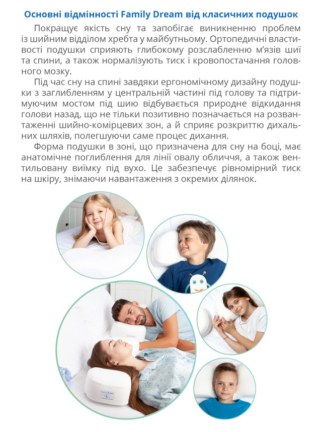 Подушка Family Dream завдяки запатентованій формі та ретельно продуманим зонам для сну, підтримує шию й голову в анатомічно правильному положенні, як при сні на спині, так і при сні на боці. Правильним положенням вважається розміщення шийного відділу хребта і голови в пряму лінію.