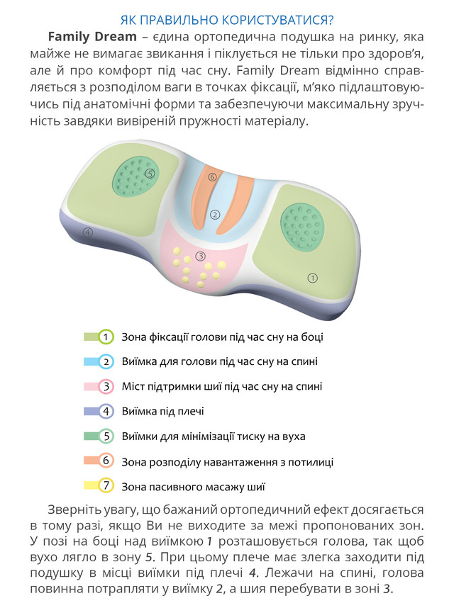 Зверніть увагу, що бажаний ортопедичний ефект досягається в тому разі, якщо Ви не виходите за межі пропонованих зон. У позі на боці над виїмкою 1 розташовується голова, так щоб вухо лягло в зону 5. При цьому плече має злегка заходити під подушку в місці виїмки під плечі 4. Лежачи на спині, голова повинна потрапляти у виїмку 2, а шия перебувати в зоні 3.